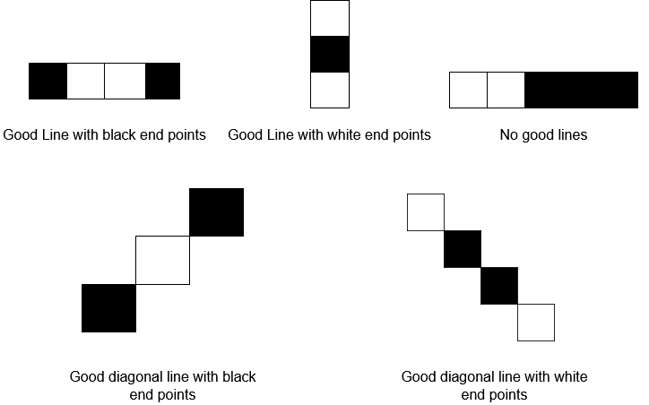 游戏中每次操作步骤为:选择一个空格子,将它变成你正在执行的颜色(要么白色,要么黑色)。但是,合法 操作必须满足:涂色后这个格子是 {mark % 好线段的一个端点} (好线段可以是水平的,竖直的或者是对角线)。