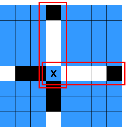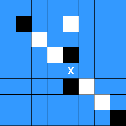 解释:’.’,’W’ 和 ‘B’ 分别用颜色蓝色,白色和黑色表示。格子 (rMove, cMove) 用 ‘X’ 标记。